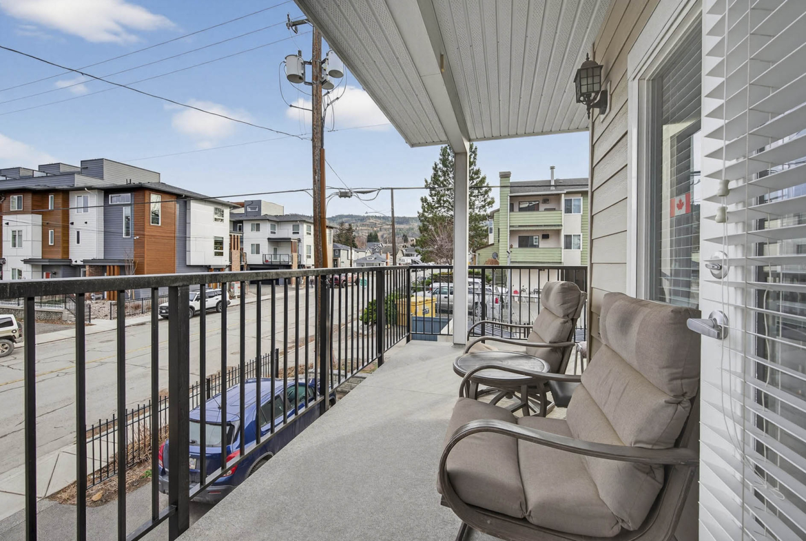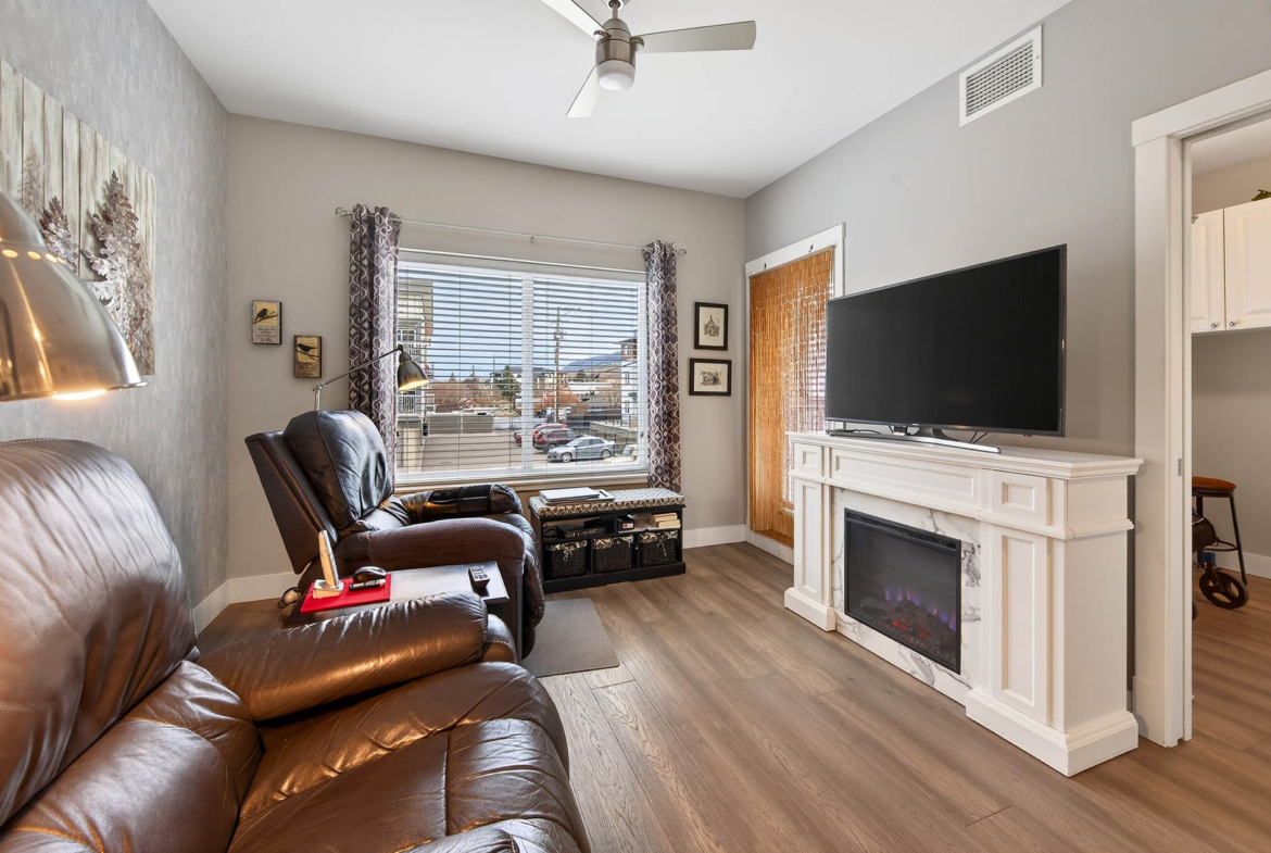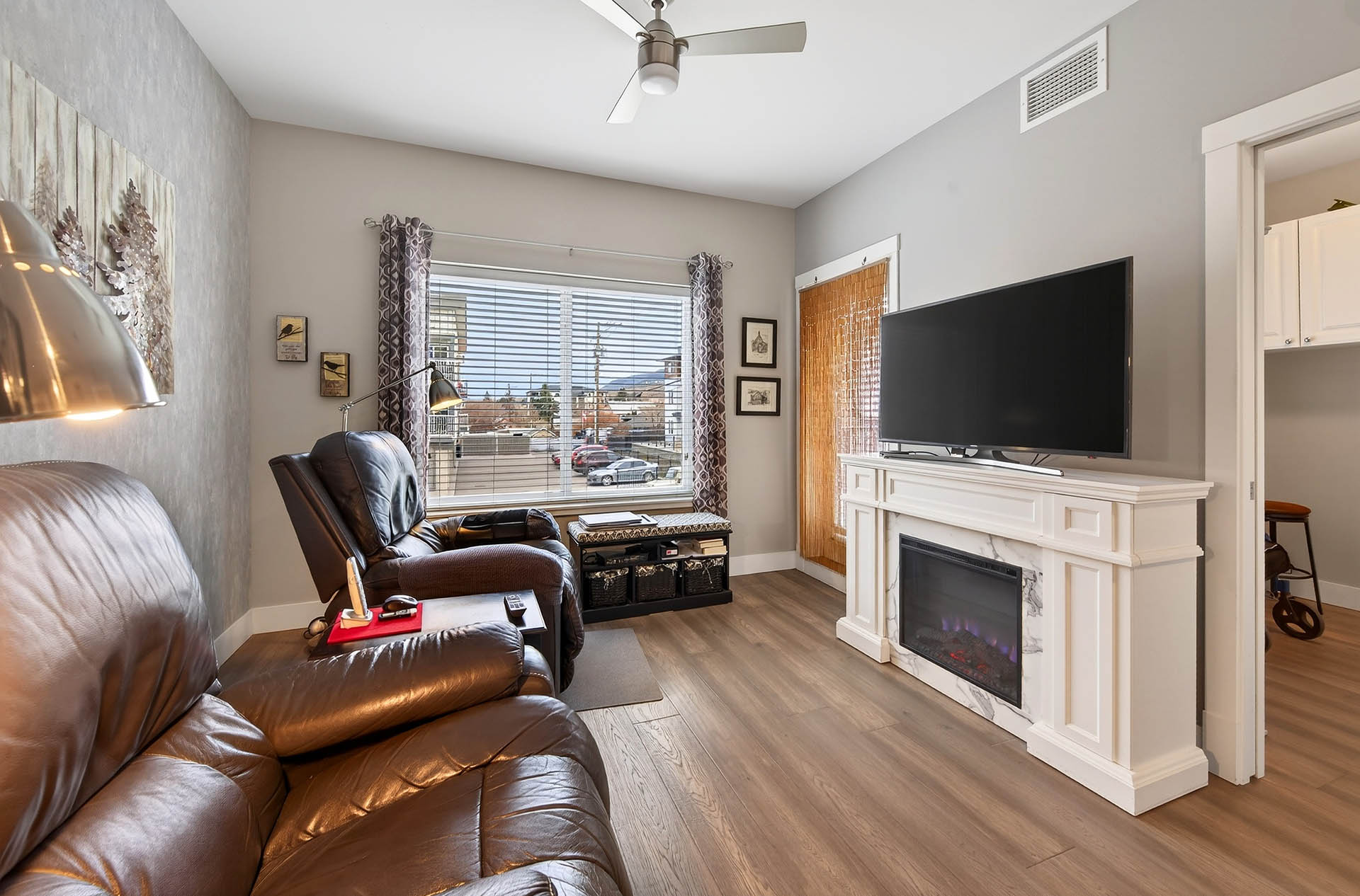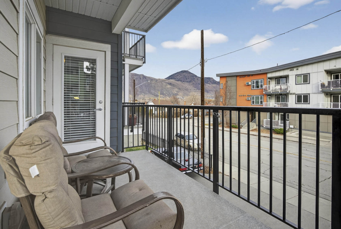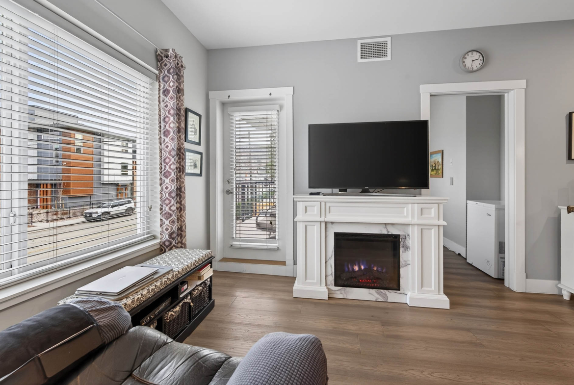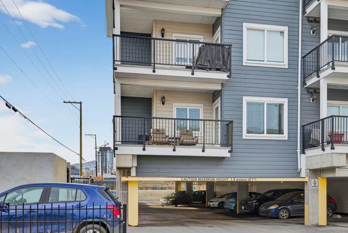 Welcome to this bright 1 bedroom + den corner unit, built in 2017 and offered by the original owners. Located on the second floor, this home features a larger-than-average deck with east and south exposure — perfect for morning sun and outdoor living. The open-concept kitchen includes upgraded appliances and an oversized island with added storage. The den (7’ x 8’4”) is ideal for a home office or guest space. Features include forced air natural gas heating with central A/C, in-suite laundry, secure fob entry with intercom, elevator access, a nearby storage locker, and a large community room for entertaining. Rentals are allowed and pets are permitted with strata approval. One covered parking stall is included. Enjoy an unbeatable downtown location with excellent walkability to shops, dining, and everyday amenities. A modern, move-in-ready home in a prime setting.