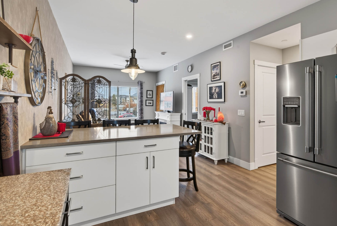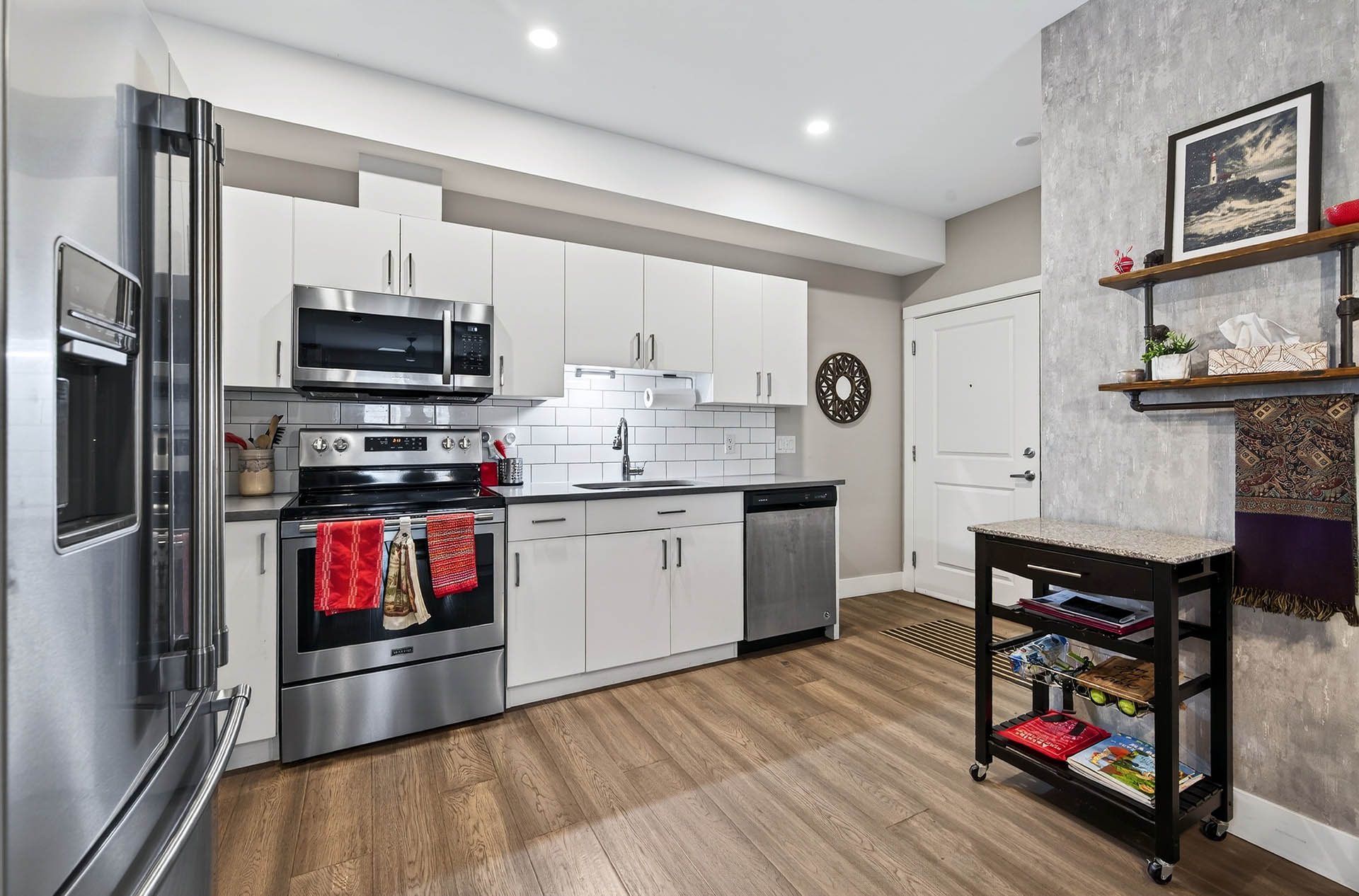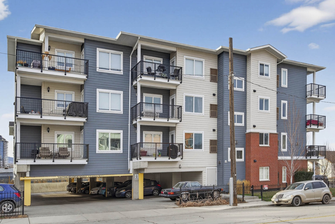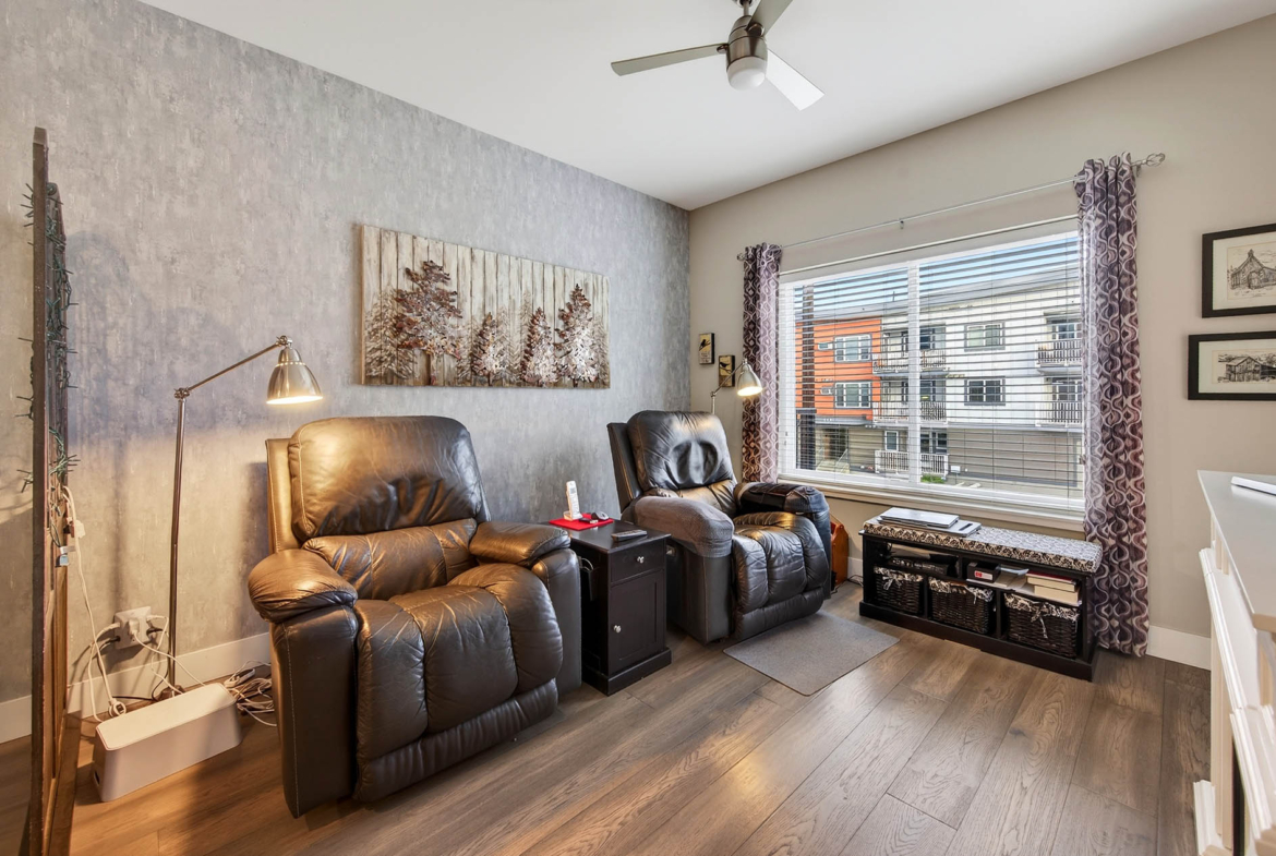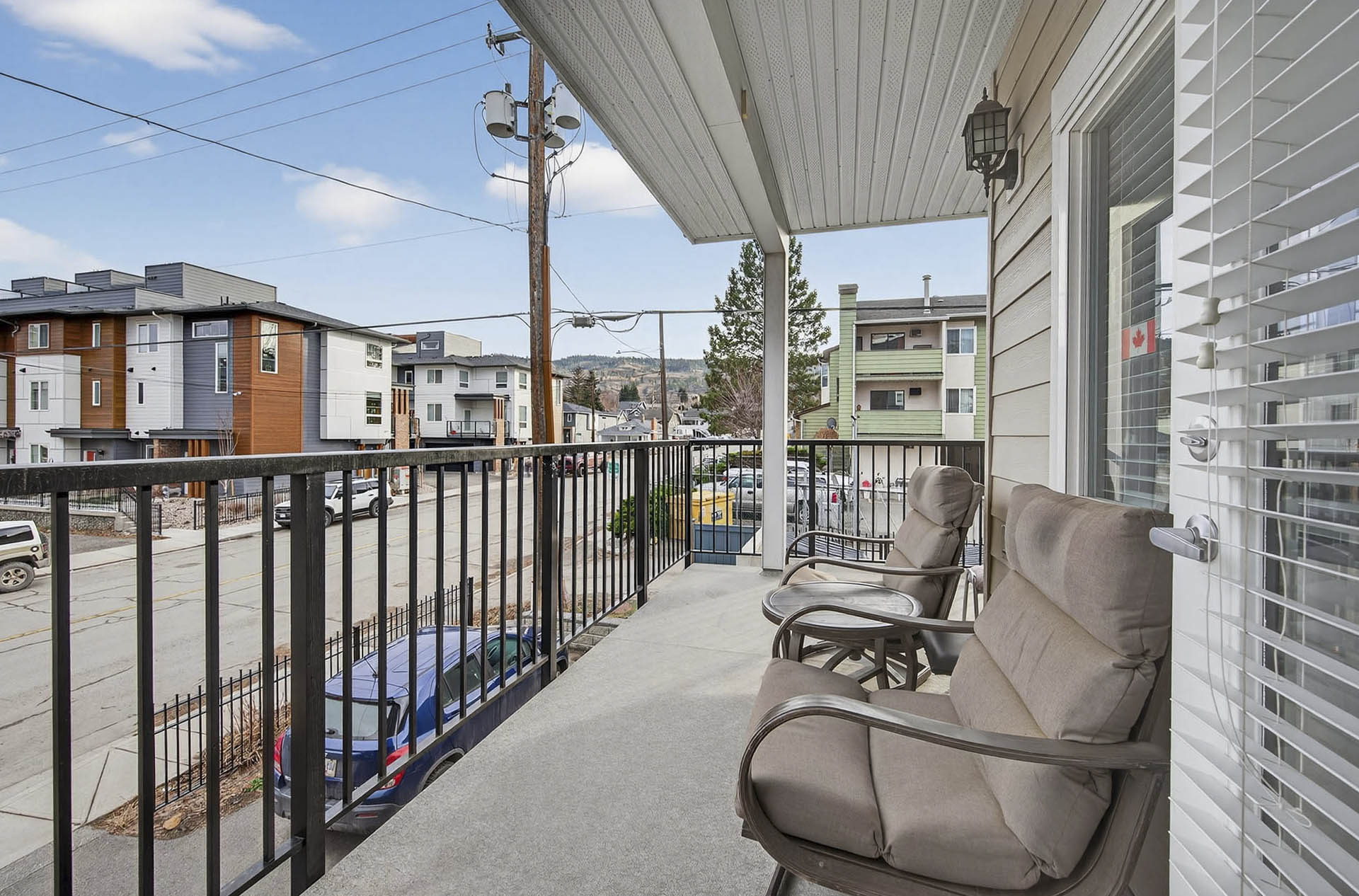 Welcome to this bright 1 bedroom + den corner unit, built in 2017 and offered by the original owners. Located on the second floor, this home features a larger-than-average deck with east and south exposure — perfect for morning sun and outdoor living. The open-concept kitchen includes upgraded appliances and an oversized island with added storage. The den (7’ x 8’4”) is ideal for a home office or guest space. Features include forced air natural gas heating with central A/C, in-suite laundry, secure fob entry with intercom, elevator access, a nearby storage locker, and a large community room for entertaining. Rentals are allowed and pets are permitted with strata approval. One covered parking stall is included. Enjoy an unbeatable downtown location with excellent walkability to shops, dining, and everyday amenities. A modern, move-in-ready home in a prime setting.