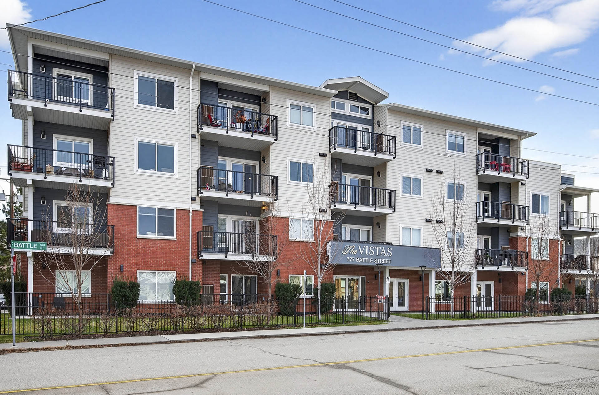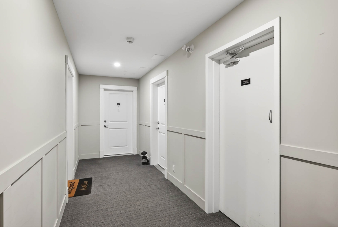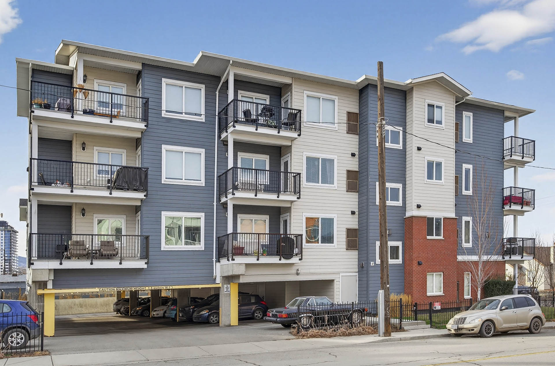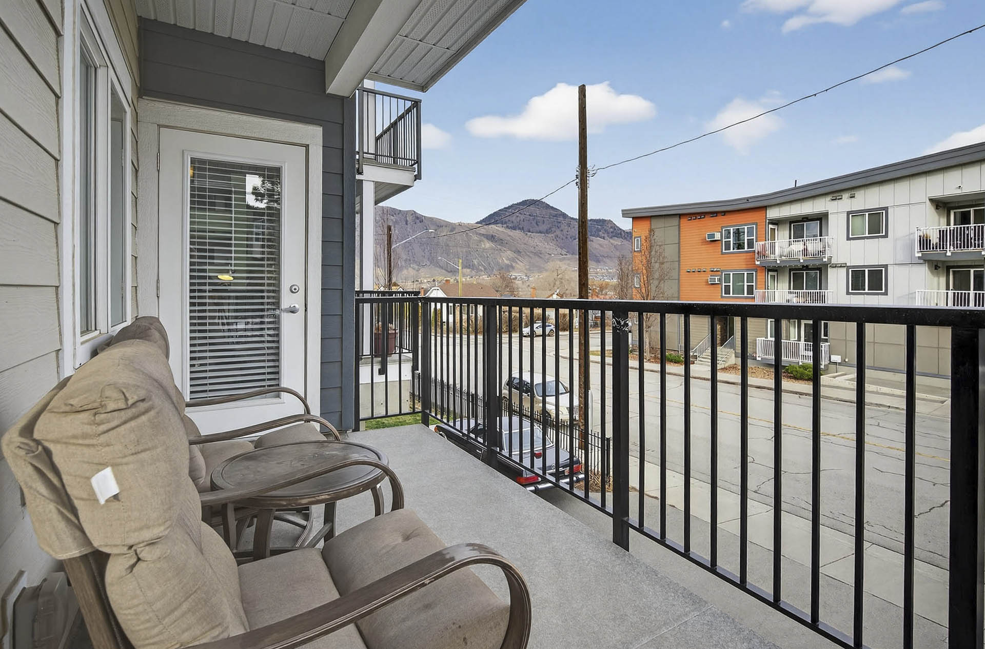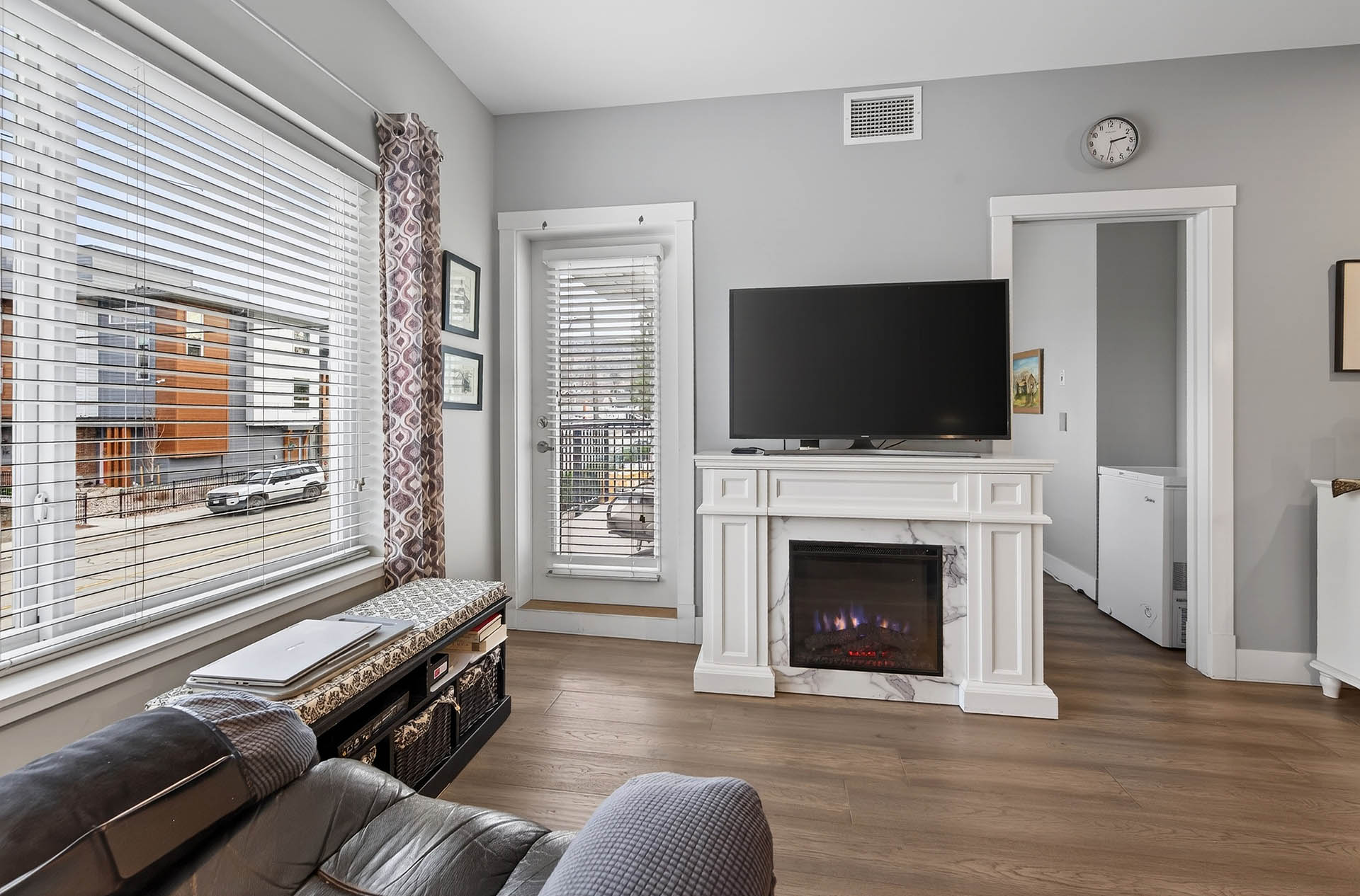 Welcome to this bright 1 bedroom + den corner unit, built in 2017 and offered by the original owners. Located on the second floor, this home features a larger-than-average deck with east and south exposure — perfect for morning sun and outdoor living. The open-concept kitchen includes upgraded appliances and an oversized island with added storage. The den (7’ x 8’4”) is ideal for a home office or guest space. Features include forced air natural gas heating with central A/C, in-suite laundry, secure fob entry with intercom, elevator access, a nearby storage locker, and a large community room for entertaining. Rentals are allowed and pets are permitted with strata approval. One covered parking stall is included. Enjoy an unbeatable downtown location with excellent walkability to shops, dining, and everyday amenities. A modern, move-in-ready home in a prime setting.